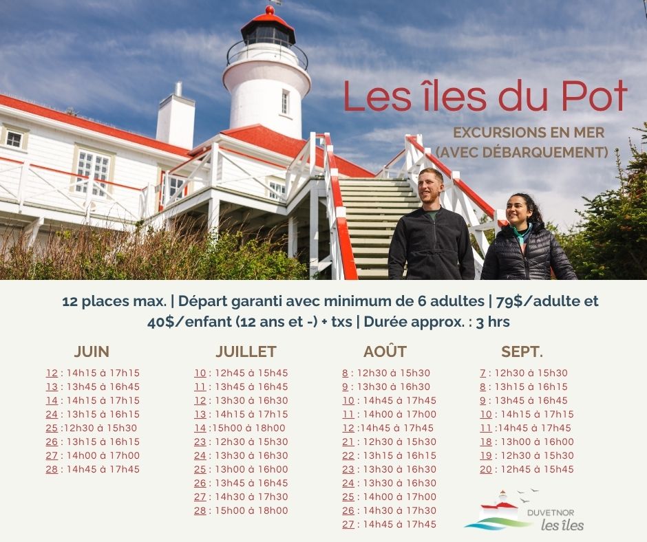 Croisière autour des îles du Pot à l’Eau-de-Vie (sans débarquement). Grande diversité d’oiseaux marins (avant la fin de juillet), paysages, notes fascinantes sur l’histoire maritime (contrebande, comptoir maritime…). Le calendrier 2026 sera annoncé en mai.